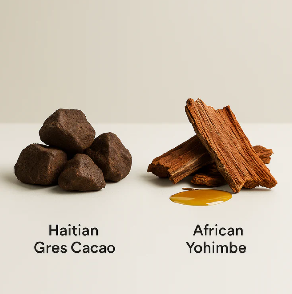 Haitian gres cacao fuels nitric oxide to open the floodgates of blood flow. African yohimbe removes the brakes, trapping that blood in and pressurizing the erectile chambers.